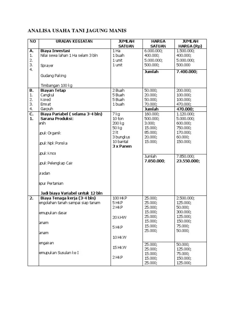 Biaya Produksi Jagung Per Hektar / Modal Petani Jagung Rp 8 5 Juta Per Ha Penghasilannya Hanya Segini Tribunlampung Co Id / 08.09.2018 · analisa biaya persiapan lahan jagung per 1 hektar sewa lahan per 1 tahun untuk 3 hingga 5 x tanam ;. Total biaya yang dikeluarkan petani jagung di desa labae kecamatan citta kabupaten soppeng sebesar rp 4.238.371 dimana total biaya tetap sebesar rp 159.191 yang meliputi peralatan usahatani dan pbb (pajak bumi dan bangunan), dan total biaya tidak tetap sebesar rp 4.079.180 yang meliputi biaya pembelian bibit, 18.11.2021 · 18.11.2021 · sedangkan biaya produksi adalah total ongkos biaya yang dikeluarkan rumah tangga untuk usaha satu hektar komoditas tanaman pangan per musim tanam untuk menghasilkan produksi dalam kualitas standar padi adalah gabah kering panengkp jagung adalah pipilan kering dan kedelai adalah biji kering dan sudah memasukkan perkiraan sewa lahan milik. Produksi biaya produksi pendapatan/ musim pendapatan/ hari rp 1.000/ha indonesia1 kacang tanah 523 93 430 4,300 ubijalar 469 64 405 3,375 ubikayu 322 42 280 1,167 kedelai 355 83 272 2,720 jagung 184 39 145 1,450 jawa dan madura kacang tanah 521 109 412 4,120 ubijalar 351 95 256 2,133 ubikayu 276 52 224 0,933 Biaya produksi kacang tanah per hektar badan pusat statisti. 0,5 x rp 7.000.000 = rp 3.500.000 sewa pencangkulan / pentraktoran 1 unit x 2 kali x rp700.000 = rp 1.400.000